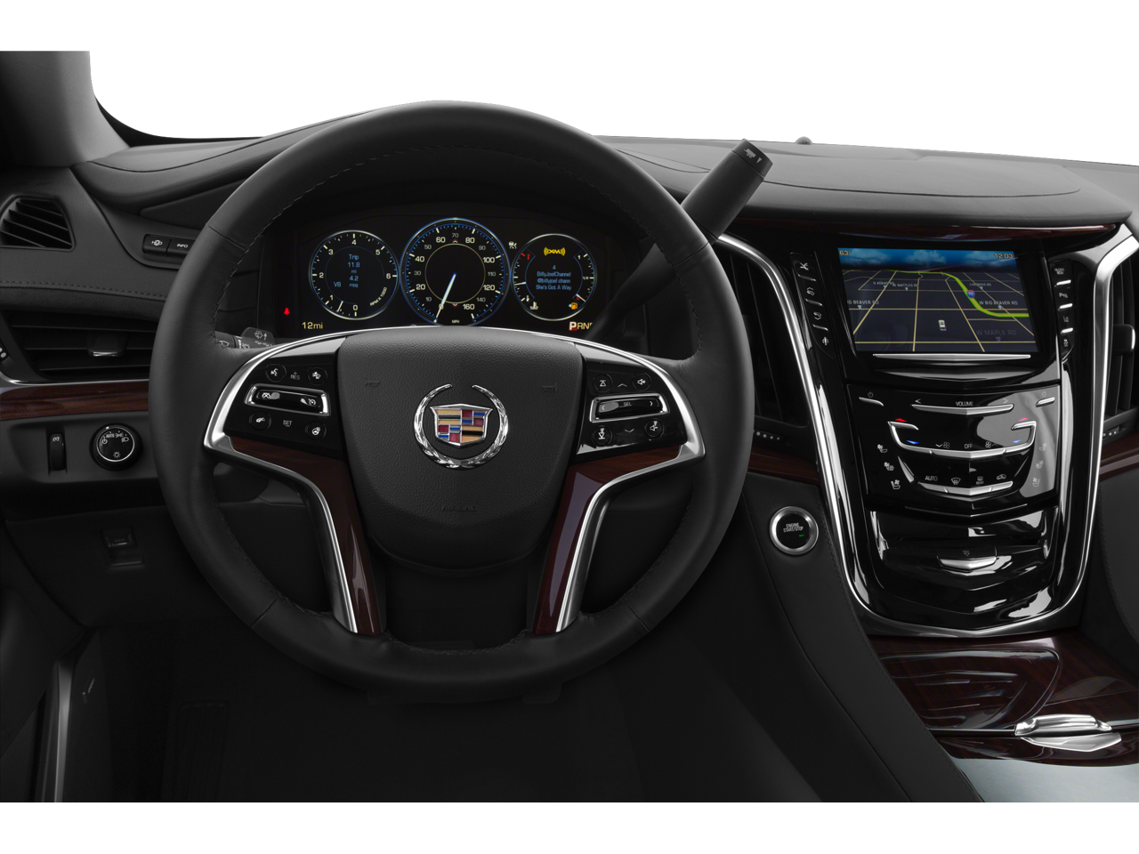 "By far the biggest leap forward for the new Cadillac Escalade, the interior is now fit for a full-size luxury SUV boasting soft-touch materials as far as the eye can see. Cut and sewn leather and real wood give off a more refined feel. " -KBB.com.
